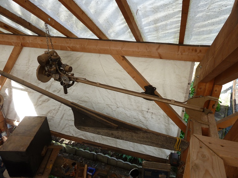 This example was seen in the 5th Wind boatyard in France, it seems like the type of straight shaft outboard which is seen in the far east (and some of the James Bond movies) only somewhat older and more modest. The whole device looks like it pivots on that vertical post and presumably the long shallow draft was good for the Loire river with is shallows and frequent sand bars.