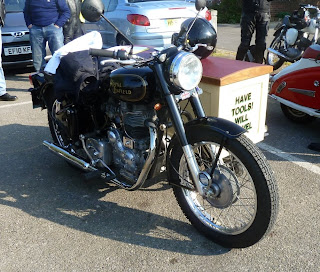 Many years ago I started riding motorbikes on an early 1960's Royal Enfield Crusader which was a 250cc single cylinder, it was old, neglected, unreliable and had been painted a horrid emerald green by one of the many previous owners. It was certainly nothing like this 350cc Bullet which is immaculate and complete with sidecar, which has a charming "Wallace & Grommet" quality - Have tools will travel.